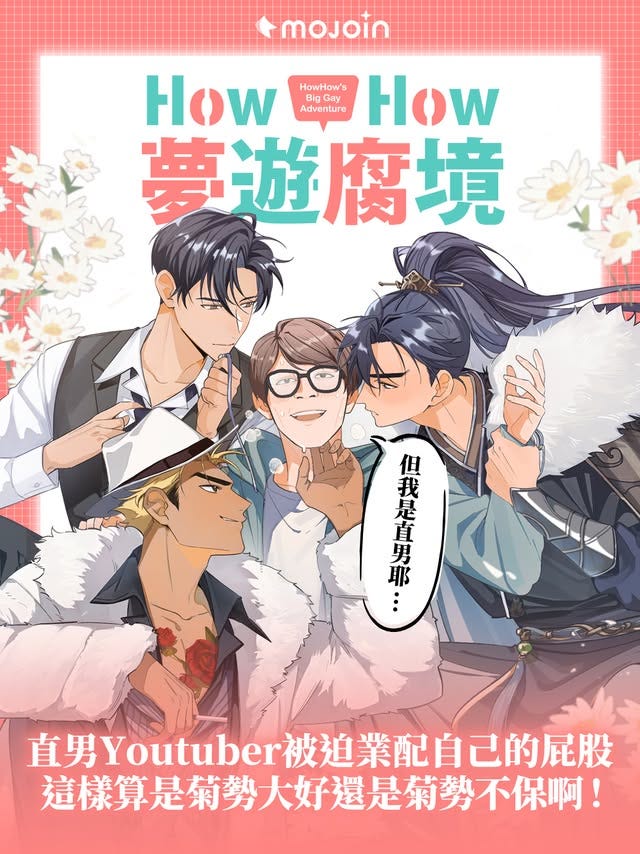 對應上則新聞,台灣網漫平台「MOJOIN」,與 Youtuber「HowHow」合作,並由台灣 BL 作家「吐維」攜手推出首部 BL 小說《HowHow夢遊腐境》,而且劇情走向會隨著讀者投票進行。